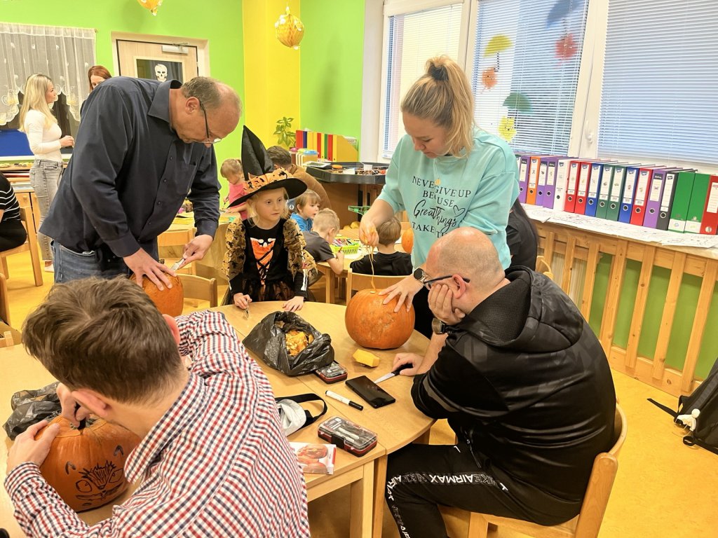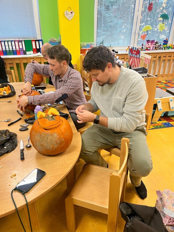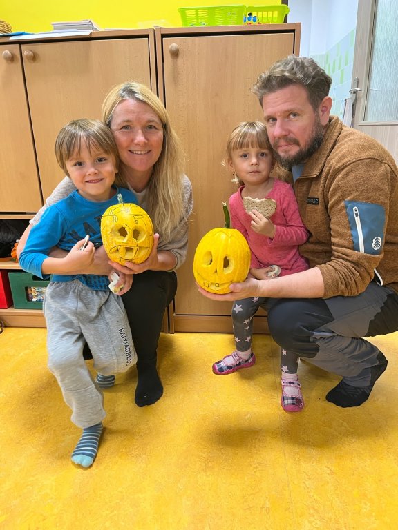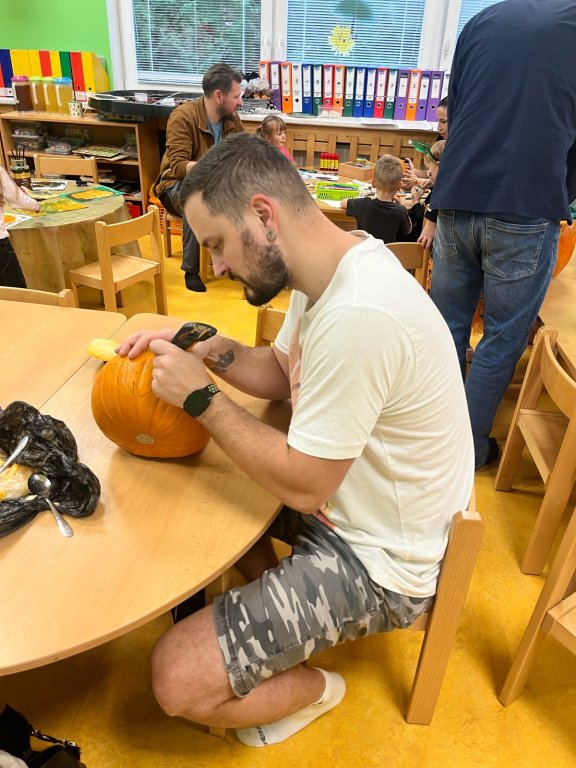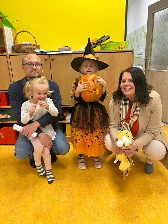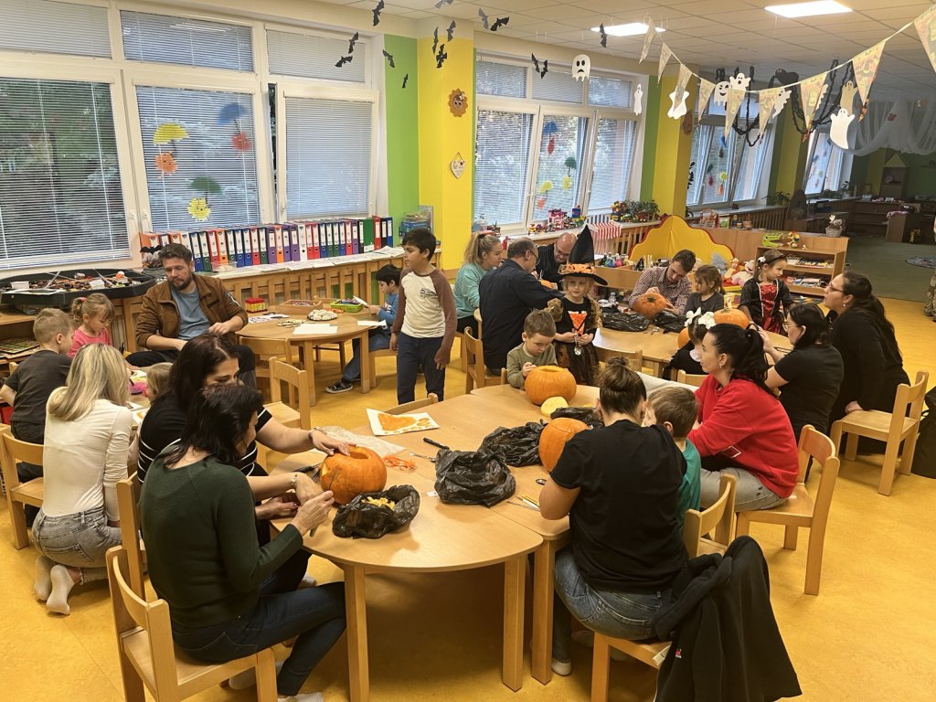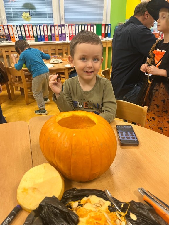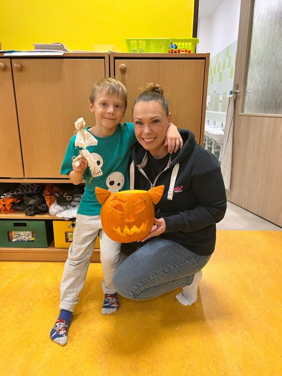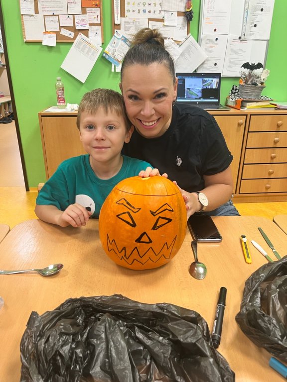 Podzim je tu a s ním i naše oblíbená tradice – dlabání dýní! U Včeliček jsme si tuto krásnou aktivitu užili společně s rodiči a dětmi při podzimní tvořivé dílničce, která se nesla v duchu přicházejícího Halloweenu. Odpoledne se včelí třída proměnila ve voňavou dílnu plnou oranžových dýní, povídání, dobrůtek a fantazie. Děti s pomocí rodičů nejprve vymýšlely, jak bude jejich dýně vypadat, někdo zvolil strašidelný výraz, jiný veselý úsměv nebo dokonce kočičí postavu. Poté se rodiče pustili do dlabání a vyřezávání. Dýně rozsvítíme a světýlkem vyženeme zlé duchy ze školky. Svíčky také hotovým dýním dodají kouzelnou atmosféru. Celé odpoledne se neslo v duchu spolupráce, kreativity a společného prožitku. Děti si při práci procvičily jemnou motoriku, trpělivost i schopnost domluvit se s ostatními. Rodiče si zase užili příjemný čas se svými dětmi a možnost nahlédnout do školkového života. Na závěr jsme si dýně vystavili v šatně, kde vytvořily kouzelnou podzimní výstavu. Každá dýně je jiná, stejně jedinečná jako děti a rodiče, které ji tvořili. Děkujeme všem rodičům za účast, ochotu i dobrou náladu. Těšíme se na další společné tvoření!