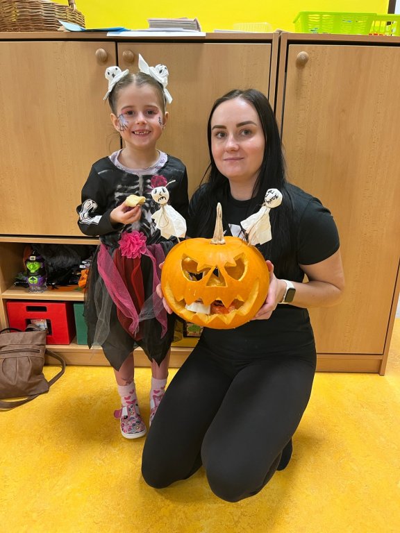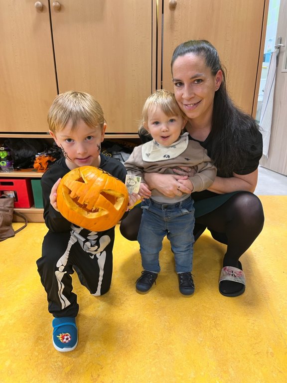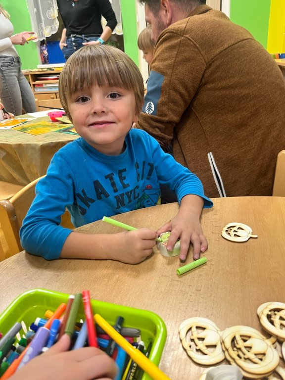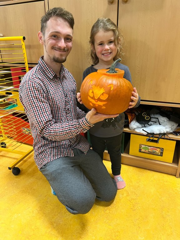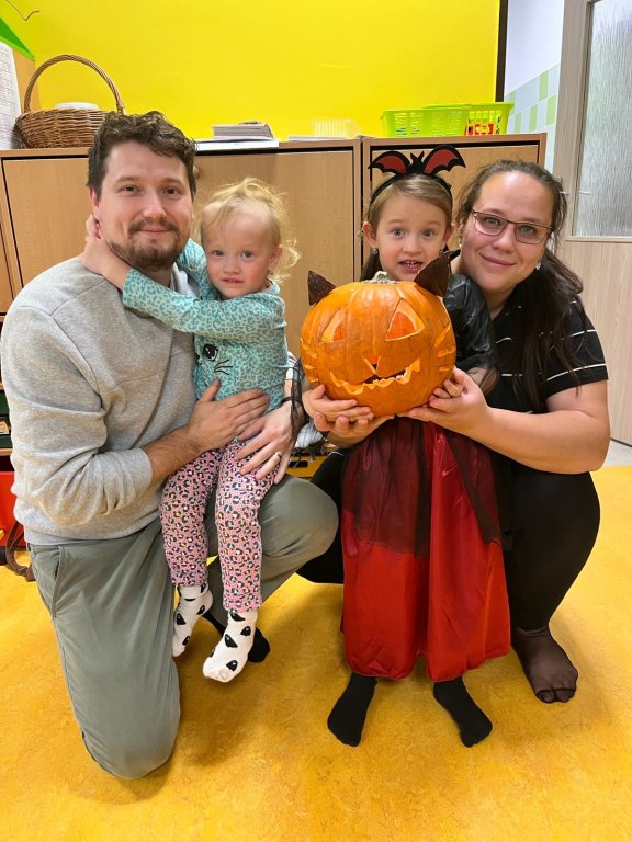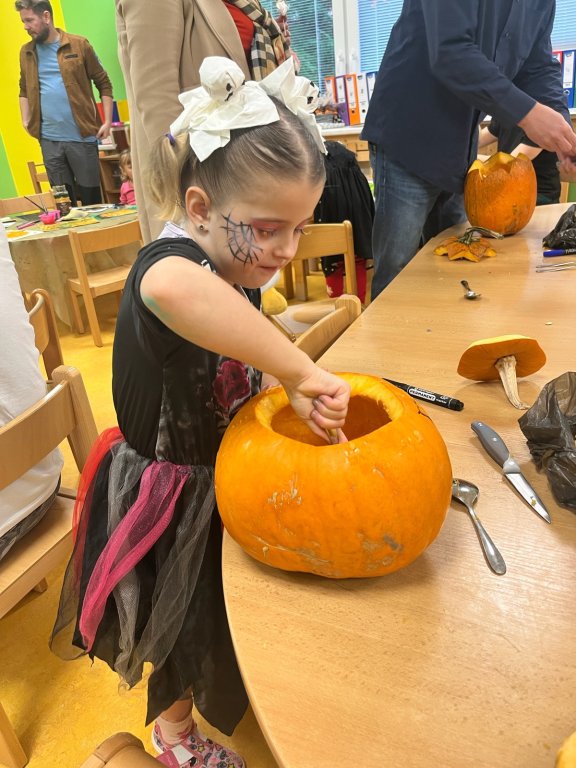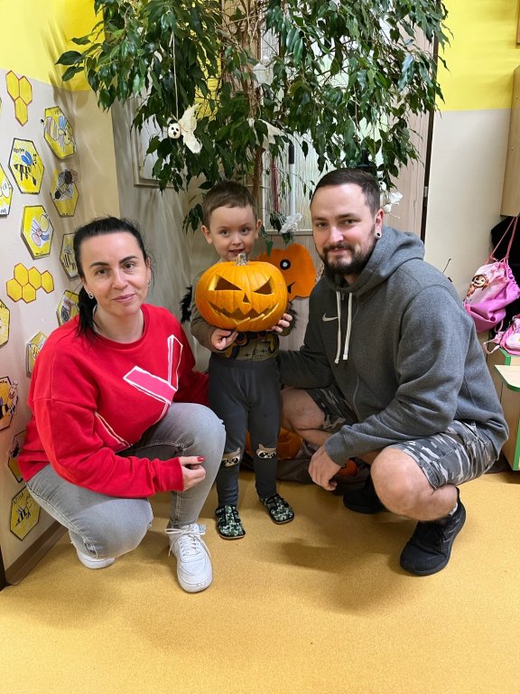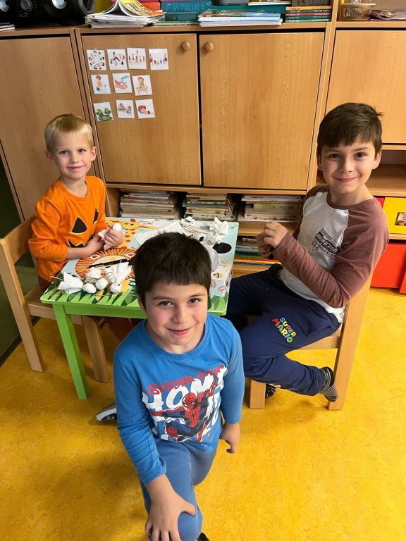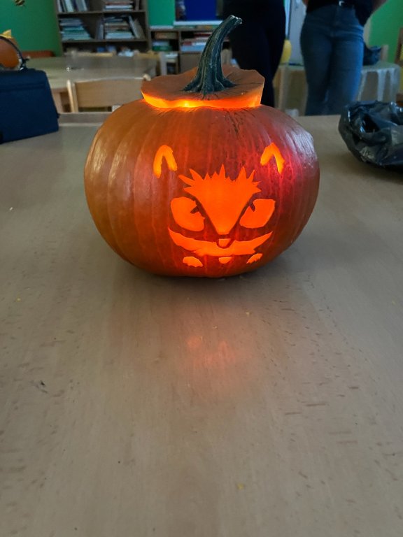 Podzim je tu a s ním i naše oblíbená tradice – dlabání dýní! U Včeliček jsme si tuto krásnou aktivitu užili společně s rodiči a dětmi při podzimní tvořivé dílničce, která se nesla v duchu přicházejícího Halloweenu. Odpoledne se včelí třída proměnila ve voňavou dílnu plnou oranžových dýní, povídání, dobrůtek a fantazie. Děti s pomocí rodičů nejprve vymýšlely, jak bude jejich dýně vypadat, někdo zvolil strašidelný výraz, jiný veselý úsměv nebo dokonce kočičí postavu. Poté se rodiče pustili do dlabání a vyřezávání. Dýně rozsvítíme a světýlkem vyženeme zlé duchy ze školky. Svíčky také hotovým dýním dodají kouzelnou atmosféru. Celé odpoledne se neslo v duchu spolupráce, kreativity a společného prožitku. Děti si při práci procvičily jemnou motoriku, trpělivost i schopnost domluvit se s ostatními. Rodiče si zase užili příjemný čas se svými dětmi a možnost nahlédnout do školkového života. Na závěr jsme si dýně vystavili v šatně, kde vytvořily kouzelnou podzimní výstavu. Každá dýně je jiná, stejně jedinečná jako děti a rodiče, které ji tvořili. Děkujeme všem rodičům za účast, ochotu i dobrou náladu. Těšíme se na další společné tvoření!