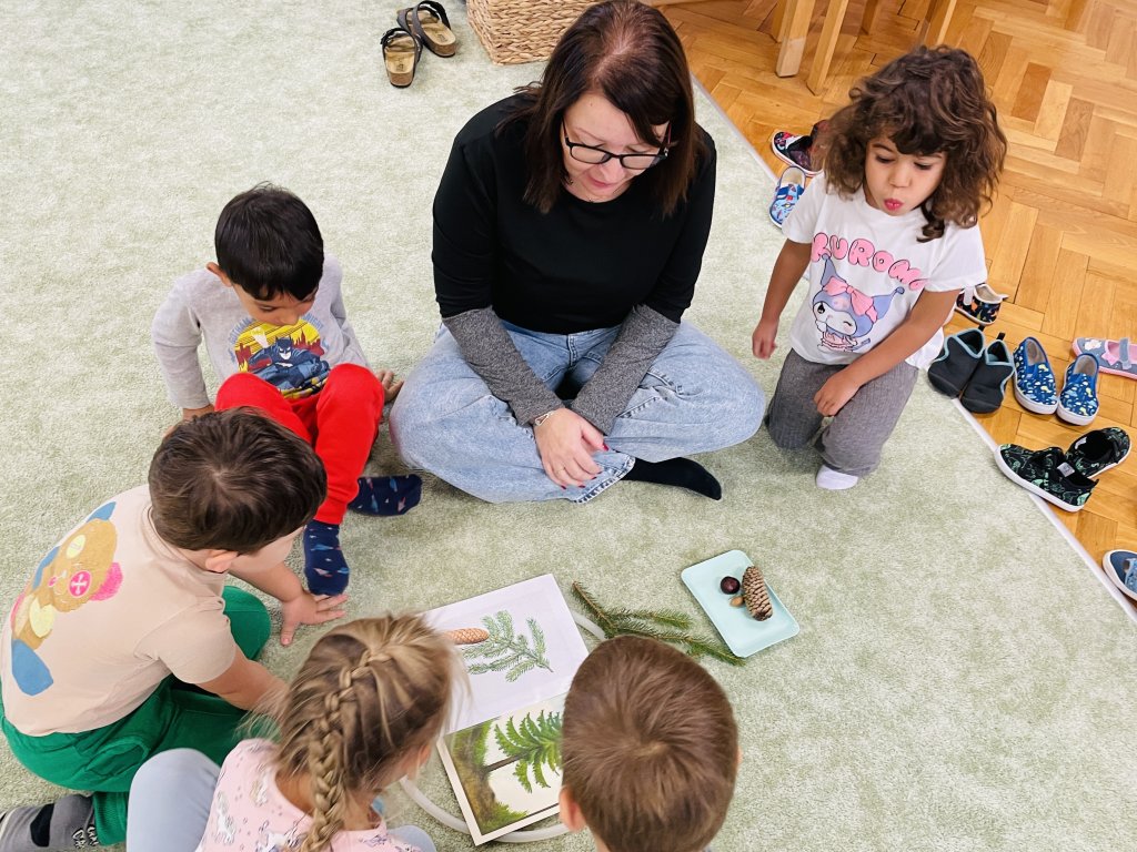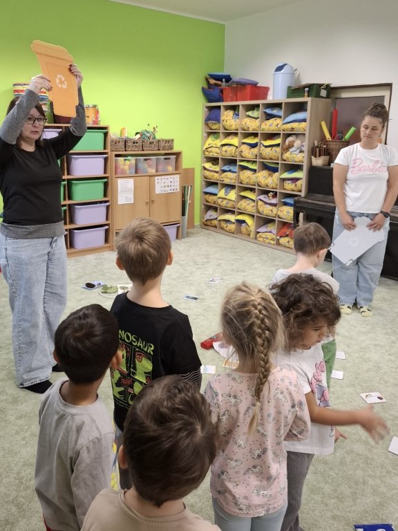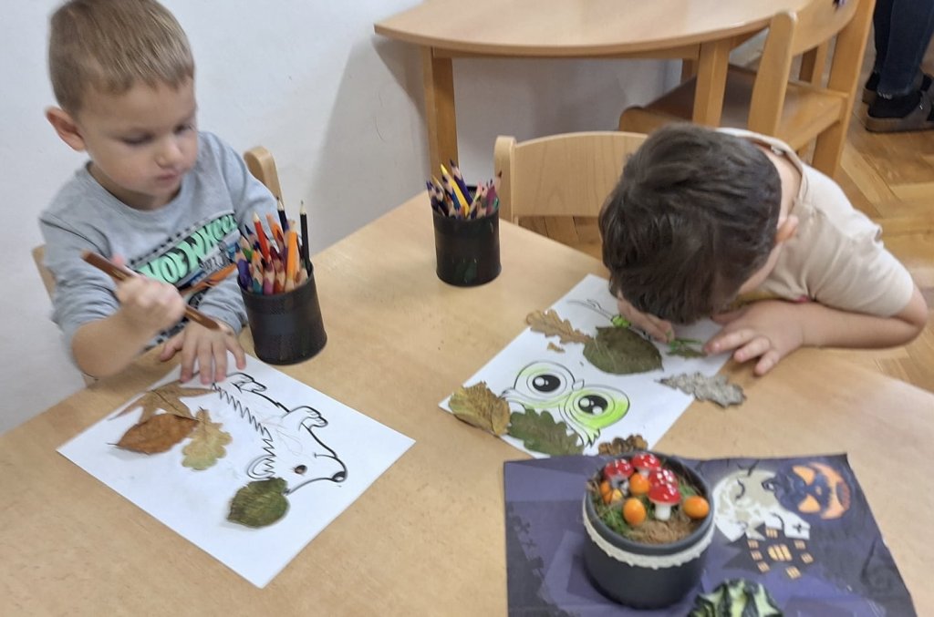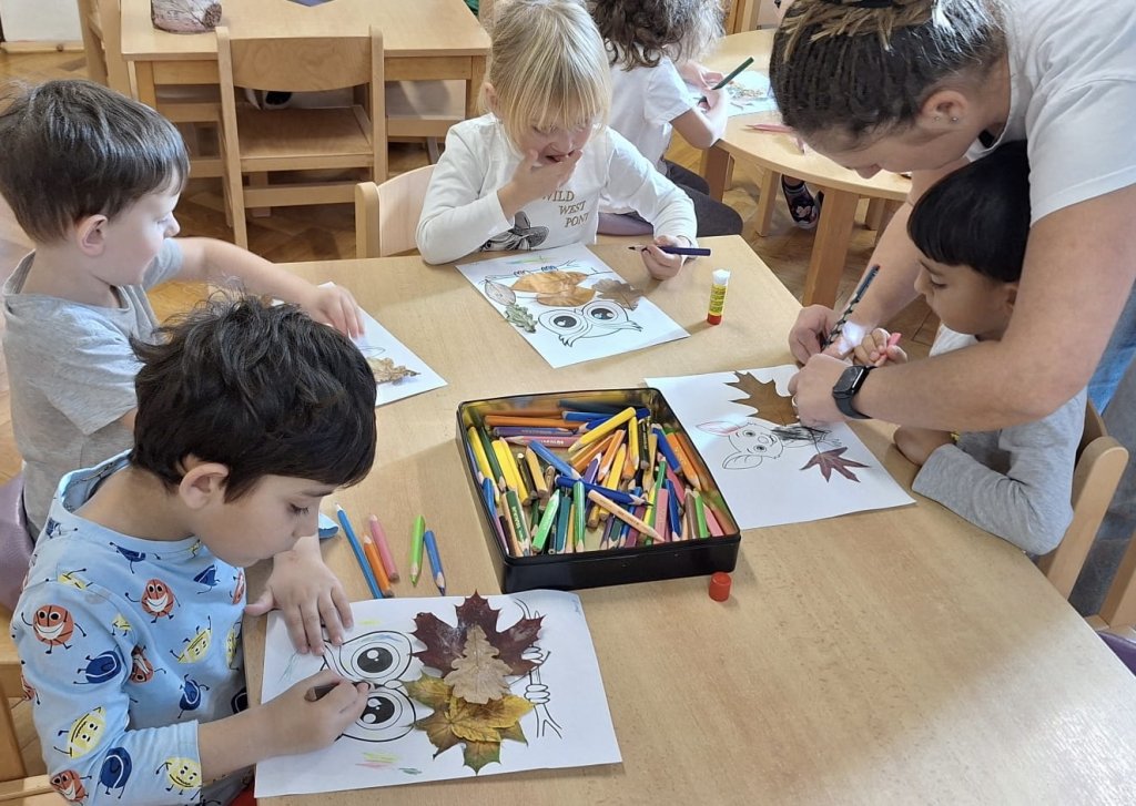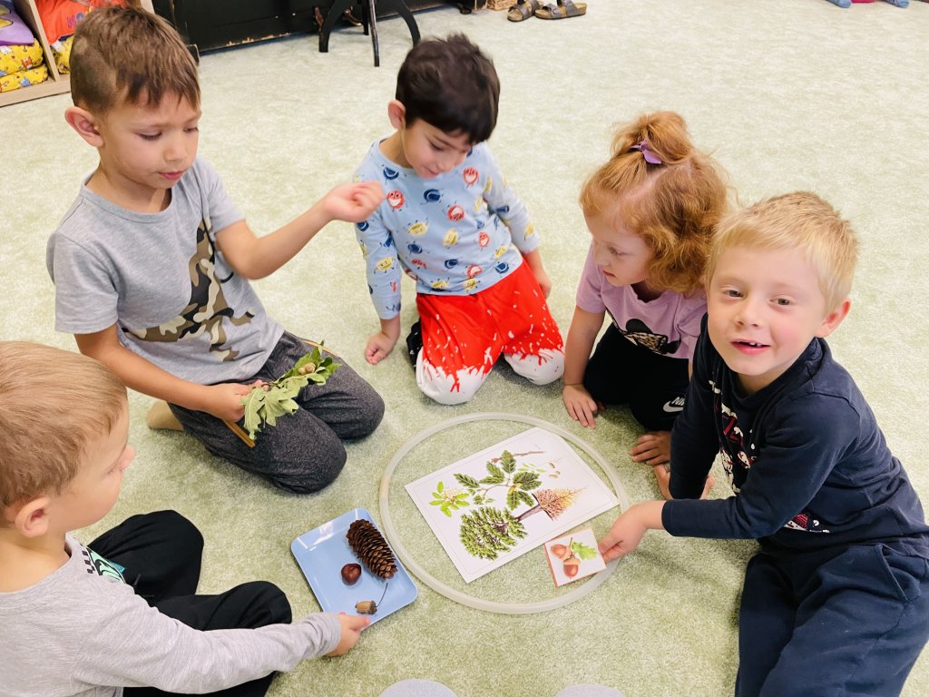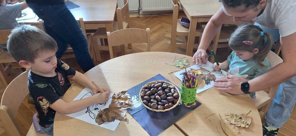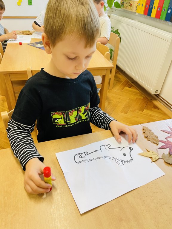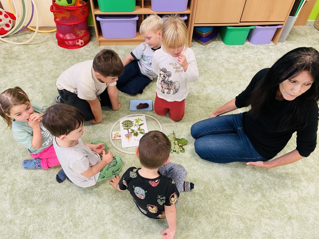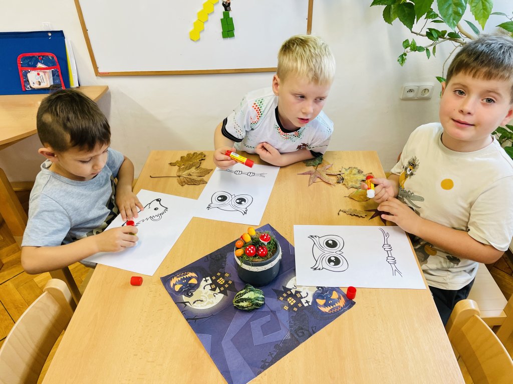 Říjen byl plný objevování a poznávání přírody. Celý měsíc byl pod vedením jednoho ze členů Tlapkové patroly – Trackerem, který má na starosti zvířata a přírodu. Děti si hravou cestou ověřily, co všechno se během uplynulých týdnů naučily. Společně jsme si zatančili na oblíbenou písničku „Vyrostla štíhlá jedlička“, a zasadili pomyslný les, kde jsme poznávali stromy, určovali jejich plody i listy. Z nenadání se však vynořil vandal, který náš les zaneřádil odpadky. Děti vědí, jak se v lese chovat, a ani na chvilinku nezaváhaly, pomohly uklidit nepořádek, a přitom si uvědomily, jak důležité je pečovat o místo, kde žijeme. V krásném čistém lese přeci houby porostou, a že jich bylo! Děti sbíraly houby do červených košíčků – jedovaté, a do zelených košíčků – jedlé. Na závěr jsme se pustili do tvoření – z barevného podzimního listí vznikly nádherné výtvory, kterými jsme ozdobili plot naší školky. Teď ho zdobí pestrá paleta barev, která každému kolemjdoucímu připomene, že podzim může být opravdu kouzelný. Byl to báječný, hravý a větrný měsíc plný zážitků, smíchu a barevného podzimu.