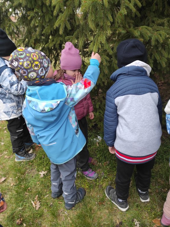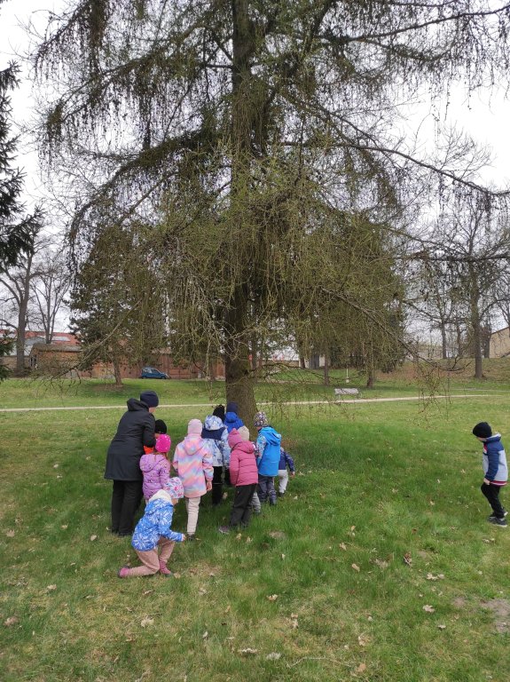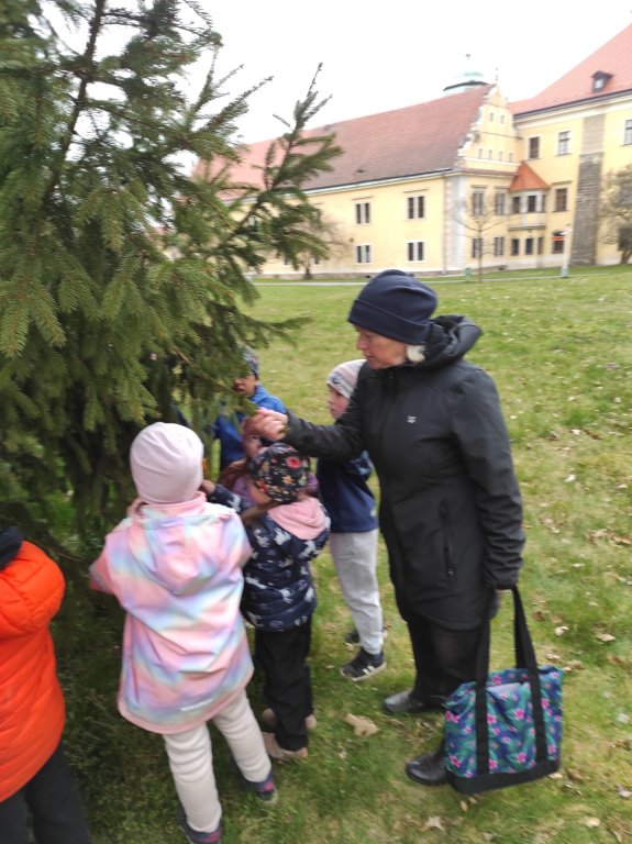 Motýlci se v pátek o vycházce vydali do zámku na bádání jarní přírodou na pozvání paní Irenky Procházkové. Zámek a zámecký park známe, jako své boty, chodíme tam často na procházky a zámecký park tak vidíme ve všech jeho ročních podobách. Babi Irenka nám ale ukázala park z úplně jiného pohledu, tak trochu zakletý a začarovaný a před normálním světem tak trochu schovaný. Hledali jsme stromy jehličnaté a taky listnaté. Listnaté jsou stále ještě holé, ale příroda už na nich čaruje a schovává tam své panáčky a panenky, které se ale nejdříve musí opylovat. Našli jsme také na modřínu už nové růžové šištičky panenek a schované kluky a na břízách jsme také pozorovali malé jehnědy klučičí a holčičí. Dětem se takto hravou formou odkryla spousta tajemství a pak už se samy staly detektivy a pátraly a hledaly po parku. Paní Irence moc děkujeme za netradiční a zajímavé bádání a my budeme nadále zkoumat jehnědy a kočičky pod mikroskopem ve školce a těšit se na další přírodovědnou procházku s paní Procházkovou.